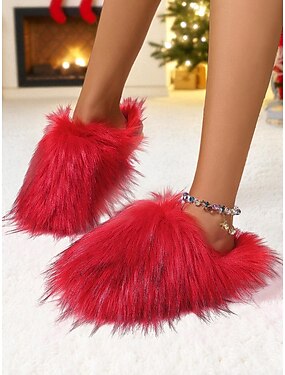 女性用の赤い毛皮のスリッパ、豪華な毛皮のスリッポンハウススリッパ、家でくつろいだり、クリスマスやリラックスしたりするための快適な履物