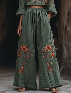 女性用 ワイドレッグ パンツ パラッツォパンツ ファッション ボヘミアン 全長 ハイウエスト フラワー 弾性ウエスト プリント 通気性 快適 ストリート デイリーウェア お出かけ アーミーグリーン 春 秋 レギュラー