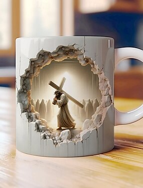 イエスの3Dセラミックコーヒーマグ330ml/12オンス、十字架を背負った弟子を描いたキリスト教ギフトカップ、祈り、教会、イースター、信仰のホームデコレーション用の宗教的な白いセラミックマグ