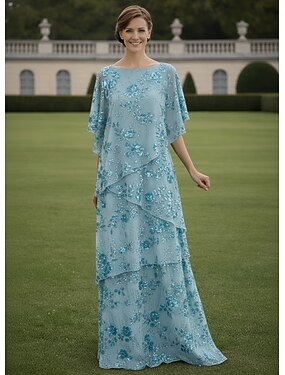 Aライン ドレス フロア丈 ウェディングゲストドレス イブニングガウン マダムドS 半袖 ボートネック エレガント 豪華 装飾された フォーマル 結婚式のゲスト 祝日 シフォン 〜と フラワープリント 3Dフラワー スパンコール