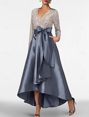 Aライン アシメントリー カクテルドレス イブニングドレス ボールガウン フォーマルドレス エレガント シルキー 長袖 Vネック 結婚式 フォーマル ポケット サテン スパンコール とともに リボン