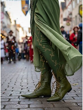 女性のエルフリーフブーツ ファンタジーグリーンのポイントレースアップシューズ リーフディテール付き カーニバル、マルディグラコスチューム、フェアリーコスプレ、フォレストテーマのパーティーに最適