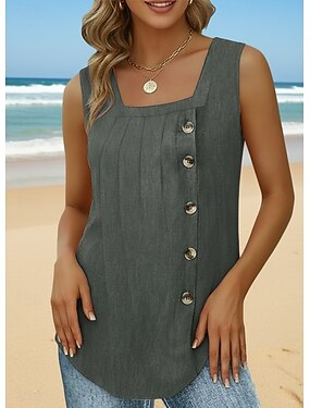 女性用 タイトトップス キャミソールタンクトップ チュニック タンクトップバック ボタン 純色 エレガント ヴィンテージ トロピカル風 ノースリーブ ストラップ スクープネック レギュラートップス 日常 ワーク お出かけ ブルー ブラック アーミーグリーン ルビーレッド ブラウン 夏 春
