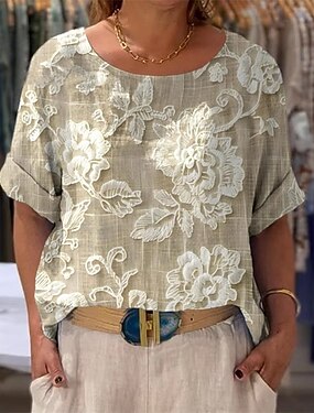 女性用リネンのようなフェイクコットンリネンシャツ プリント フローラル カジュアル 3/4長袖 クルーネック レギュラー トップス デイリー ブラック レッド パープル グリーン 夏