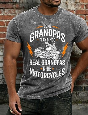 メンズ ヴィンテージ アシッドウォッシュ モーターサイクル Tシャツ 「本物のおじいちゃんはバイクに乗る」 面白いバイカーギフト Tシャツ コットン ポリエステル混紡 ミネラルウォッシュ ダメージ加工 グラフィック トップ S-4XL