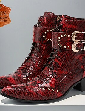ダブルバックルストラップとリベットのディテールが施されたメンズの赤いスネークプリントレザーアンクルブーツ。コンサートやパフォーマンスに最適な100%牛革ウエスタンブーツ。