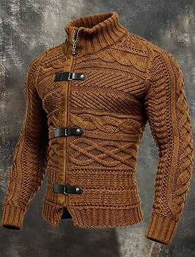 男性用 ニット カーディガンセーター タートルネックセーター かぎ針編み ニット ボタン ニット 純色 スタンド ベーシック カジュアル 日常 祝日 衣類 冬 秋 カーキ色 S M L