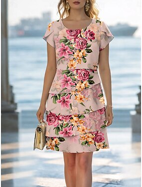 女性用 ひざ丈ドレス シフトドレス サマードレス 旅行度假风 ボヘミアン ビーチスタイル デート レギュラー フラワー グラフィック 半袖 クルーネック イエロー ピンク パープル グリーン 夏 春