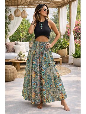 レディース Aライン マキシスカート プリント グラデーション バケーション 夏 ボヘミアン ブラック ピンク ブルー オレンジ