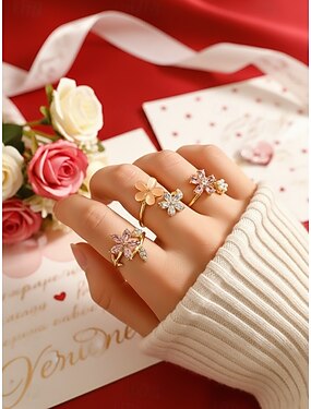 女性用合金フラワーリングセット - ピンクとクリアクリスタルを使用したエレガントなデザイン。カジュアルにもフォーマルにも最適です。