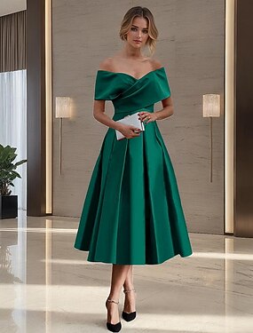 Aライン セミロング丈 カクテルドレス パーティードレス エレガント ノースリーブ オフショルダー ガーデンパーティー 結婚式 ストレッチサテン とともに プリーツ フリル