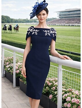 タイト/コラム セミロング丈 パーティードレス 二次会ドレス / カクテルドレス ウェディングゲストドレス マダムドS 半袖 オフショルダー エレガント シンプル 結婚式のゲスト ストレッチ生地 〜と リボン パール装飾 刺繍