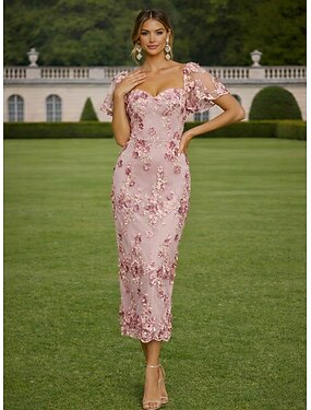 タイト/コラム アンクル丈 レースドレス カクテルドレス エレガント ヴィンテージ フローラル 半袖 ハートカット ガーデンパーティー 結婚式 サテン チュール とともに 3Dフラワー 刺繍 アップリケ