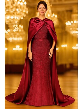 タイト/コラム フロア丈 ビーズ刺繍 フォーマルドレス 花嫁の母のドレス ケープ付きボールガウン イブニングドレス フォーマルドレス エレガント ヴィンテージ きらびやかな ノースリーブ クルーネック 結婚式 フォーマル シャンパンマザーオブブライドドレス サテン スパンコール とともに グリッター素材 ショール