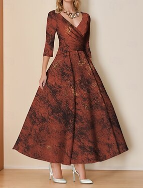 Aライン フロア丈 カクテルドレス パーティードレス エレガント 七分袖 Vネック ガーデンパーティー 結婚式 サテン とともに プリーツ フリル
