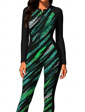 女性用 ラッシュガード フルボディラッシュガード ワンピースサーフィンスーツ レオパード 縞柄 抽象的 ジッパーを閉める 内蔵ブラ付き フロントファスナー UVサンプロテクション フルカップ UPF50+ 長袖 フルボディー スイムウェア ボディスーツ サーフィン カヌー ビーチ 夏