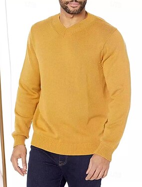 男性用 ニット プルオーバーセーター リブ ニット レギュラートップス ニット スリムフィット 平織り Vネック ニット コンテンポラリー カジュアル デイリーウェア 衣類 秋冬 ゴールデン イエロー M L XL