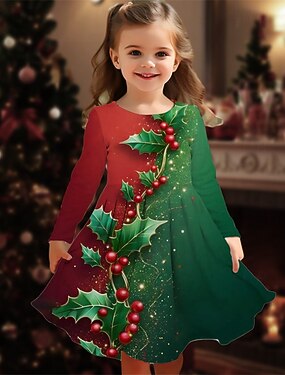 クリスマス 女子 3D グラフィック リーフ柄 ドレス 長袖 春 秋 バケーション 日常 祝日 プリンセス 美しい 甘い 子供 4〜12年 カジュアルドレス A ラインドレス 膝丈 レギュラー