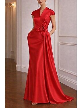 ボールガウン スイープ/ブラシトレーン イブニングドレス オーバースカート付きボールガウン エレガント ストラップ Vネック 結婚式 フォーマル ストレッチサテン とともに 3Dフラワー プリーツ
