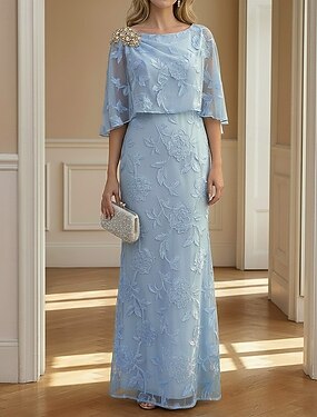 Aライン タイト/コラム ドレス フロア丈 ウェディングゲストドレス フォーマルドレス イブニングガウン マダムドS ハーフスリーブ ボートネック エレガント シンプル ミニマリスト フォーマル シフォン ジャカード ショール 〜と フリル クリスタル装飾