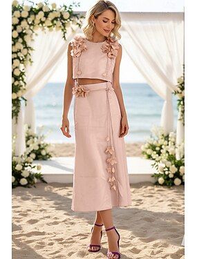 ツーピース Aライン アンクル丈 ウェディングゲストドレス エレガント ノースリーブ クルーネック 結婚式 バレンタイン とともに 3Dフラワー