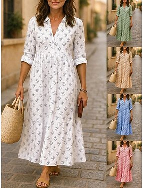女性用 マキシドレス フェイクコットンリネン カジュアルドレス A ラインドレス ファッション 近代の 日常 バケーション お出かけ レギュラー リーフ柄 長袖 シャツカラー ブルー ライトイエロー ホワイト ピンク 春 秋