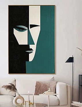 油絵 手作り 抽象 オリジナル 幾何学的 顔 キャンバス 油絵 大きな 壁 アート 黒 &白緑のテクスチャペイント、カスタムペイント、リビングルームの壁の装飾