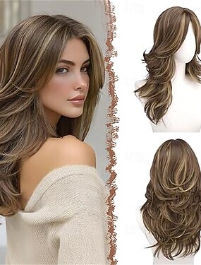 茶色とブロンドが混ざったウェーブのかかったレイヤードウィッグ、カーテンバング付き、女性用、長さ20インチの合成繊維製、自然な見た目のセンターパートウィッグ、コスチュームパーティーや普段使いに最適