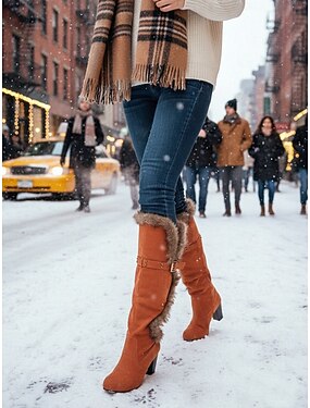 フェイクファーのトリムが付いたレディースのグリーンスエードニーハイブーツ。バックルのディテール、チャンキーヒール。冬、カジュアル、アウトドアシーンにぴったりの快適でスタイリッシュなブーツ。