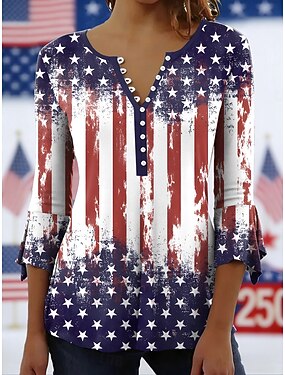 独立記念日 愛国的な レディース ブラウス グラフィック フラッグ エレガント スタイリッシュ 3/4丈スリーブ クルーネック ロング トップス デイリー お出かけ ラッフル ボタン ブルー レッド 夏 春