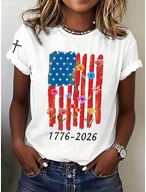 アメリカ独立記念日 女性用 Tシャツ プリント フラワー グラフィック フラッグ ヴィンテージ スタイリッシュ クラシック 半袖 クルーネック ラウンドネック レギュラートップス カジュアル 日常 ホワイト ルビーレッド 夏 春