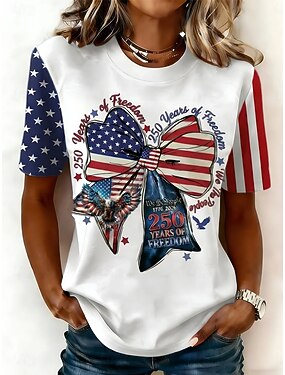 アメリカ独立記念日 女性用 Tシャツ プリント グラフィック フラッグ スタイリッシュ クラシック カジュアル 半袖 クルーネック ラウンドネック レギュラートップス 日常 ブルー ホワイト ルビーレッド レッドとブルー 夏 春