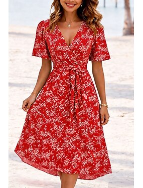 女性用 ミディドレス A ラインドレス バンデージドレス ラッフルドレス 旅行度假风 カジュアル 祝日 デート レギュラー フラワー グラフィック 半袖 Vネック ブルー ルビーレッド パープル グリーン 夏 春