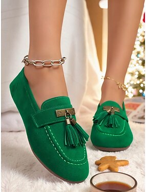 女性用グリーンタッセルローファー - クリスマス、カジュアルな日々、ホリデーの集まりにぴったりのスタイリッシュなスリッポンシューズ