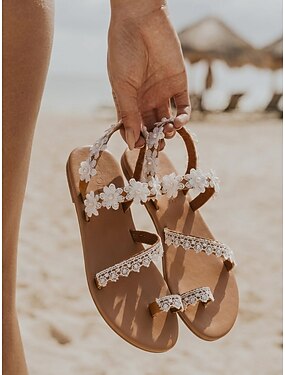 レディース ホワイト レース フローラル サンダル - ビーチでの結婚式やトロピカルな休暇にぴったりの、パールのアクセントが付いたボヘミアン風フラット トゥリング サンダル &夏のリゾートウェア