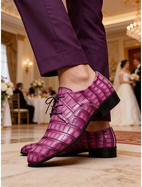 メンズフェイクレザーパープルクロコダイルプリントドレスシューズ。スタイリッシュでユニーク。フォーマルなイベントやイブニングウェア、結婚式に最適です。