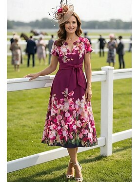 Aライン セミロング丈 フォーマルドレス マダムドS 半袖 Vネック スクープネック エレガント ヴィンテージ ショールが含まれています フォーマル ストレッチクレープ 〜と フラワープリント リボン