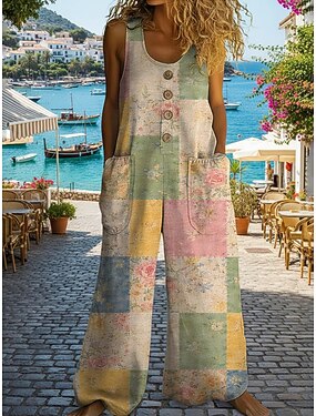 女性用 ジャンプスーツ 活発的 フラワー ノースリーブ ノー・スリーブ ワイドレッグ Uネック ポケット ボタン 日常 ビーチ ルーズフィット グリーン 夏
