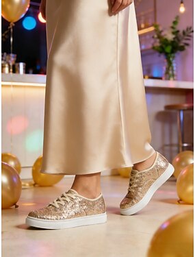 レディースゴールドグリッターレースアップスニーカー - 結婚式の二次会、旅行、普段使いにぴったりのキラキラ光るローカットカジュアルシューズ