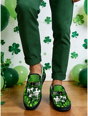 メンズグリーンフローラルスリッポンシューズ - ユニークなスカルとクローバーのデザイン。聖パトリックの日やカジュアルなお祝いにぴったりの快適でスタイリッシュなフットウェア。