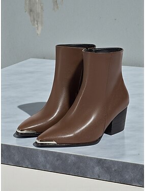 レディースブラウンフェイクレザーポインテッドトゥアンクルブーツ - メタルトゥキャップとサイドジッパー付きのウエスタンスタイルのミッドヒールブーツ。都会的なストリートウェアやオフィスの服装にぴったりのカジュアルな秋のフットウェア。