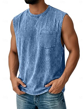 男性用 タンクトップ ベストトップ アンダーシャツ コットン100% アシッドウォッシュシャツ ノースリーブ クルーネック 夏 平織り ファッション デザイナー ベーシック ポケット 色褪せた 平織り カジュアル バケーション ストリート ブルー ブラック ピンク メンズトップTシャツ