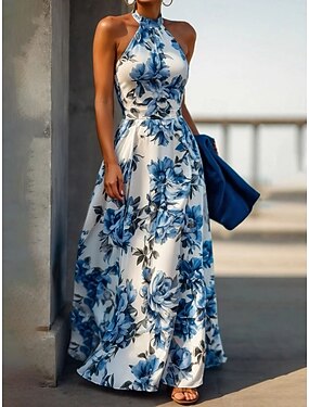 女性用 マキシドレス A ラインドレス ホルタードレス 旅行度假风 カジュアル アウトドア お出かけ レギュラー フラワー グラフィック ノースリーブ ホルターネック ブルー ピンク パープル グリーン 夏 春