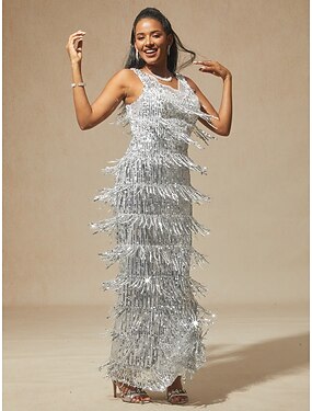 クリスマス レディース マキシドレス スパンコールドレス シフトドレス タッセルフリンジ エレガント パーティー 無地 ノースリーブ Vネック シルバー 春 秋 冬