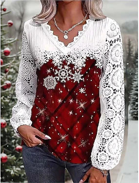クリスマス レディース スノーフレーク シャツ クロース エレガント ヴィンテージ キュート 長袖 Vネック レギュラートップス パーティー イブニングウェア デイリー ホリデー コントラスト レース パッチワーク ボタン 赤 紫 緑