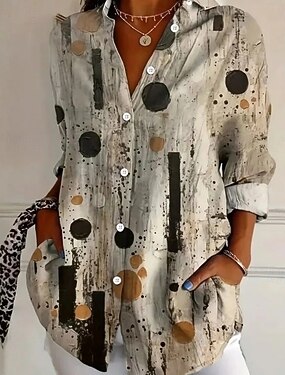 女性用 シャツ サテンシャツ プリント グラフィック カラーブロック ボヘミア ヴィンテージ スタイリッシュ 長袖 シャツカラー レギュラートップス 日常 祝日 お出かけ イエロー レインボー 夏 春 秋