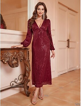 20代の轟音 1920年代風 アンクル丈 イブニングドレス 長袖 グレートギャツビー スパンコール Vネック 仮装 女性用 クリスマス カーニバル マスカレード カクテルパーティー レトロテーマパーティー 成人 ドレス