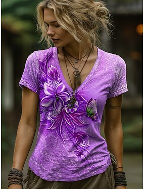 女性用 Tシャツ プリント フラワー グラフィック ヴィンテージ スタイリッシュ 近代の 半袖 Vネック レギュラートップス 日常 ピンク フクシャ グリーン 夏 春