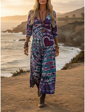 女性用 マキシドレス 自由奔放に生きるドレス ヴィンテージドレス カジュアルドレス ヴィンテージ 日常 アウトドア バケーション ルーズフィット ハート タイダイ 長袖 Vネック パープル 春 秋