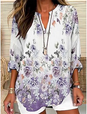 女性用ブラウス リネン風 通気性 軽量 フローラル グラフィック ヴィンテージ デイリー スタイリッシュ 長袖 Vネック ノッチネック レギュラー トップス デイリーホリデープリント 薄紫 バイオレット 夏 春 秋